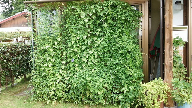 朝顔と風船カズラでジャングル状態のサンルーム。