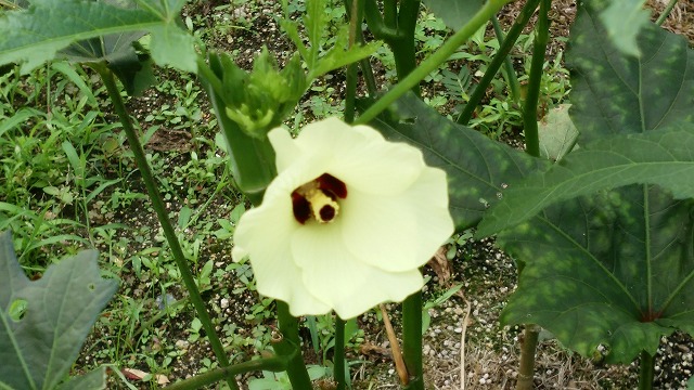 「オクラ」の花です。知人に貰った苗を数本植えたら可愛い花が楽しめて、毎日1~2本づつオクラが収穫できます。