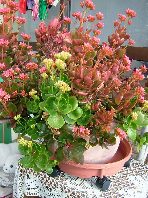 昨冬は寒さでシンビジウムやカランコエなどの鉢を大方ダメにしてしまいました。カランコエは「丈夫」で「手がかからない」と思って油断したお詫びに、春先から生き残った部分を大切に育て、寒くなってからは小さなビニールハウスに入れていた大鉢が早くも咲き始めました。