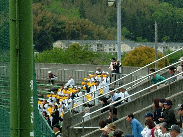 これは柳井学園の(ベンチ入りしなかった)野球部員が黄色いメガホンを持って応援している様子。岩国高校側は「授業優先」らしく、応援席は選手の親戚(父母とその他)と私たちのようなジジババでした。