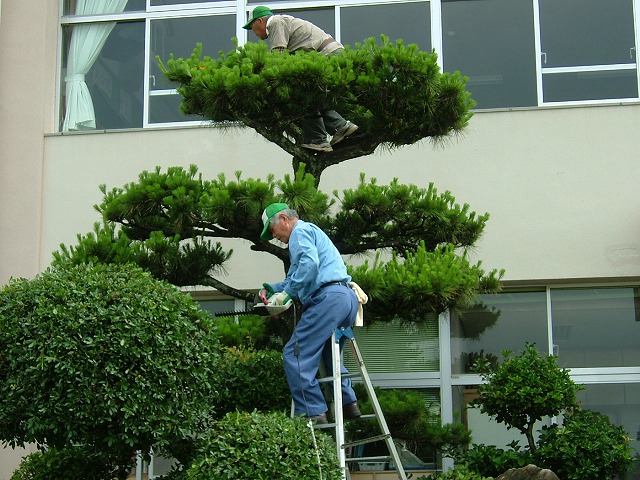もじゃもじゃに伸びた松に取りついた会員。昔とった杵柄とは言っても古希は大分前に見送った仲間たちです。事故と熱中症に注意!!です。