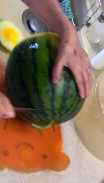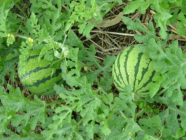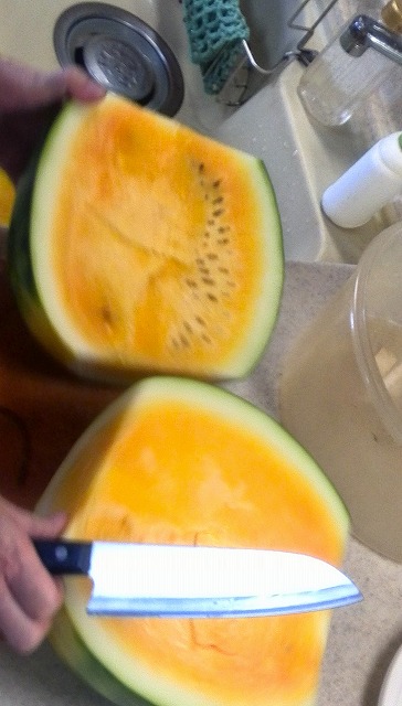スイカはこうなってこうなりました。赤・黄色・オレンジ(新種)の苗を植えたのですが、切るまで何色が出るのか解りません。これも黄色なのかオレンジなのか・・。