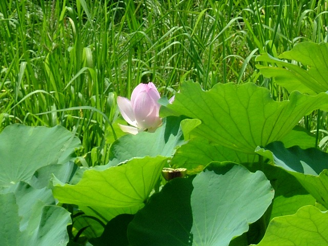スーパーマーケットに行く途中のハス田は一年間放置されていたために草で覆われてしまいました。それでも地中に残っていたらしいレンコンから芽が出てピンクのきれいな花を咲かせています。