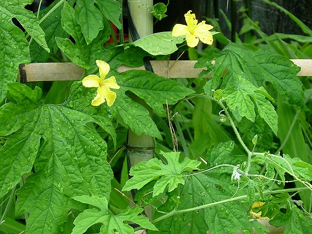 みどりのカーテンに一番多く使われる「ごーや」です。花はとても可愛く、葉っぱも良く繁るのですが、難点は「実がなる」事です。あの「苦さ」を我が家は受け付けず、従ってこの写真は他所のお宅のものです。