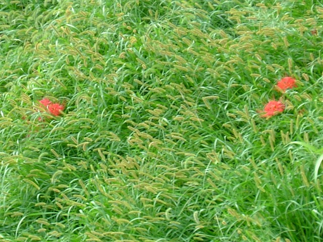 葦の間から背伸びして咲いていた曼珠沙華。写真に収めた後で葦と運命を共にしました。