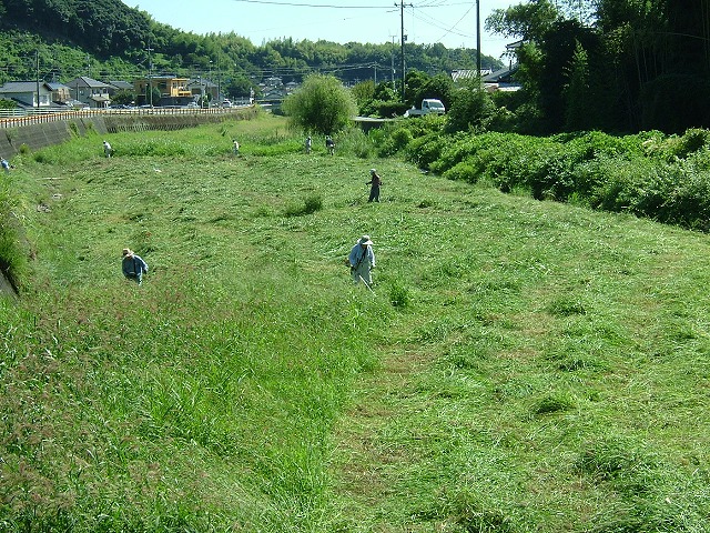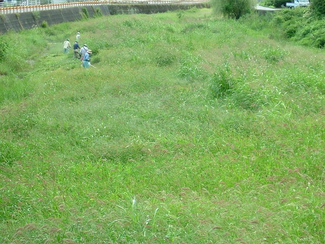 土曜日の草刈作業風景です。最初は伸びた葦に隠れてしまっている人影が、作業が進むにつれて露わになってきます。