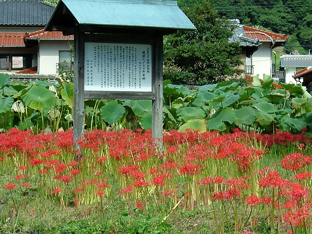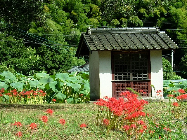 天然記念物の「イヌマキ巨樹」の下は曼珠沙華が満開です。右は同じ場所に建っている「荒神様」