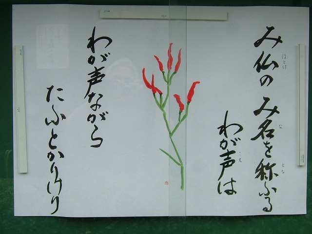 お寺の掲示板です。「み仏のみ名を称(とな)ふる 我が声は 我が声ながら たふとかりけり」 なるほどね。「般若心経」を称えたり、「主の祈り」を唱えたりの声はそんな風に聞こえる気がしますね~。