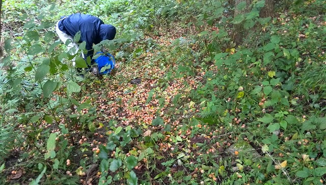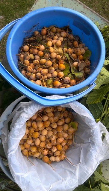 さて、これからが一仕事です。連れ合いがゴミを取り出しでっかい容器(セメントをこねたりする時に使用する)入れました。台風が来る(らしい)ので、このまま外に放置します。数日後、水でふやけて柔らかくなった果肉から種(ギンナン)を取り出して陽に当て乾燥。これで食べられます。