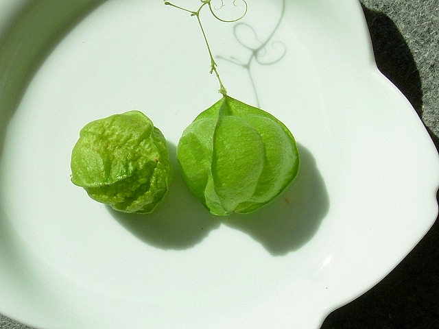今年のみどりのカーテンの「風船かずら」は去年の種から苗をつくりました。夏の間、ジャングルのように繁って風船をい~っぱいつけました。涼しくなってくると→のように熟年期に。