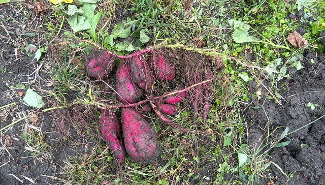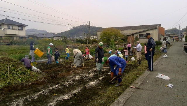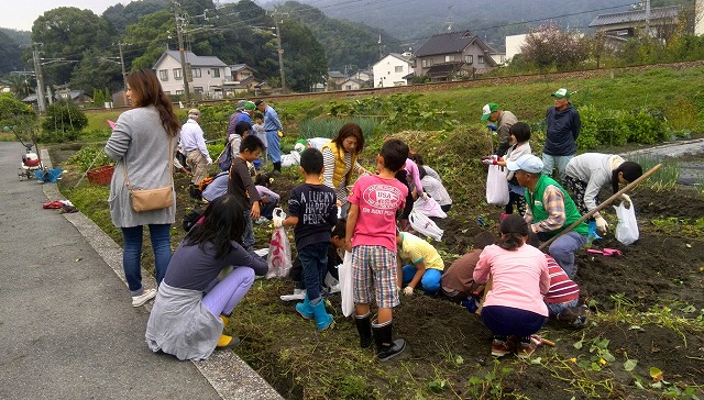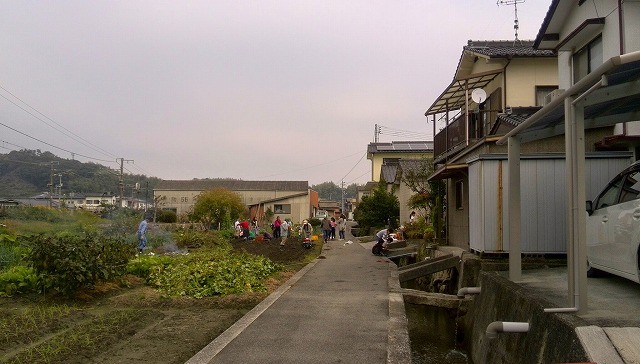降りそうで降らない重い雲が覆っていましたが、地区の子どもたちの「芋ほり」をサポートしてきました。 子どもたちのために無償で畑を貸して貰っています。写真左側の土手の上は山陽本線で、住宅と線路に挟まれた畑です。