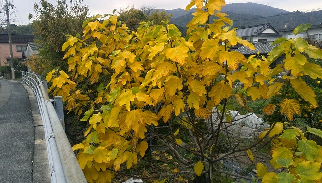 近所で見つけた見事な紅葉(モミジとイチジク)。今日の風で散ってしまった事でしょう。越してきて以来一度もきれいに紅葉した事がない我が家のモミジも、冴えない色のまま散りました。