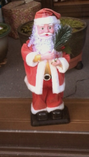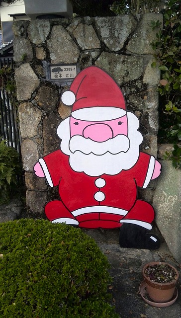 我が家のサンタたちです。左側はもう数年間この時期にお出まし願う「光って動くサンタ」さん。右側は大きな板に描かれたものです。門の外で風雨にも負けず立っています。NPOの会員の中に超がつく器用な人がおり(彼は広いジャンルのカラオケをこなし、神楽舞を舞い、絵を描き、勿論山から畑までの作業もこなします。)昨年彼が交通安全の呼びかけ用に作った物を頼み込んで貰い受けました。