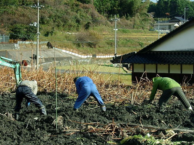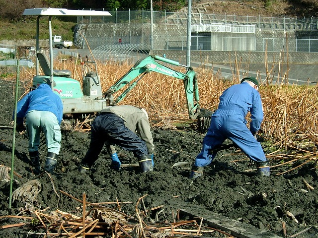 地方によっては胸までの長靴を身に付けて、高圧の水で田圃からレンコンを浮かばせて収穫するようですが、ここではもっぱら水を抜いた粘土質の田圃に入って腰をかがめて特殊な鍬を使って掘ります。