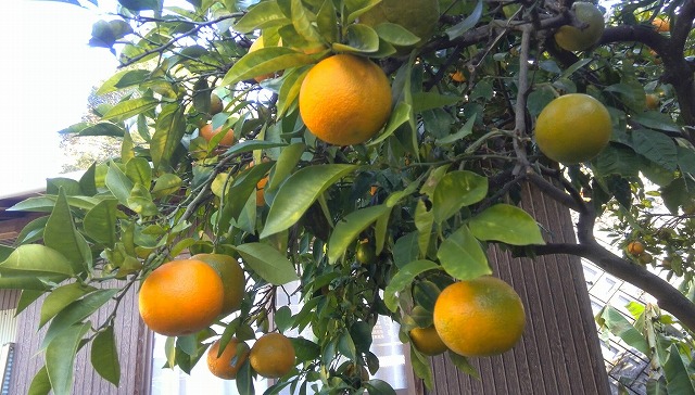 家の裏にこの実がなる木が2本あり(勿論先住者が植えたもの)、私は「酢ダイダイ」と呼んでいます。勝手に作った造語ではなく、ここで初めての冬に誰かに教わったはずです。どうやらこれは「本名」ではないらしく、人に通じなことがしばしばです。柑橘類には違いありませんが、このまま「みかん」のように食べる事はできません。夏みかんほどの大きさにもなり、色づく今からはとてもきれいな色になります。香りは抜群ですがとにかく酸っぱい!のです。用途としては「鍋物」に「なまこの酢」に「焼酎」に等々ありますが、「かぼす」や「すだち」の産地の人が何にでもそれらをかけて食べるように、サラダやお漬物にも美味しい(そうです)。2本の木に毎年100個以上実をつけるので処分に苦慮(申し訳ない!)します。すると世の中には色々な人がいるもので「毎日のように1個づつ買いに行ってる」とか「あったかいご飯にシラスを入れて絞り入れるとタマラン!」とか聞こえてくるようになりました。それからは彼女たちに送り付けます。が、毎年最初に収穫に来る知人は、人に頼まれて「しめ飾り」を作っているので、それに飾るために収穫します。例年は30余個ですが、今年は10余個だけでした。まだまだ元気な卒寿です。我が家にも素晴らしい出来の「お飾り」が届きます。