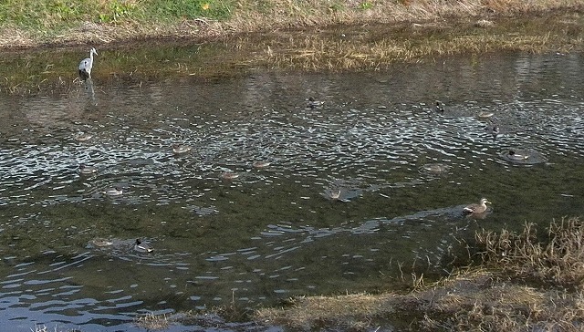 この写真は是非拡大(クリック)して観てください。川のこの場所と河口付近とはカモたちのサンクチュアリー(避難所とか鳥獣保護区)になっています。冷たい日でも平気な彼らですが、今日はこの温かさを楽しんでいるかのようにバシャバシャはしゃいでいました。オシドリもマガモもヒドリガモも仲良くシェアしています。向こう側にはダイサギも悠然と小魚を待っています。