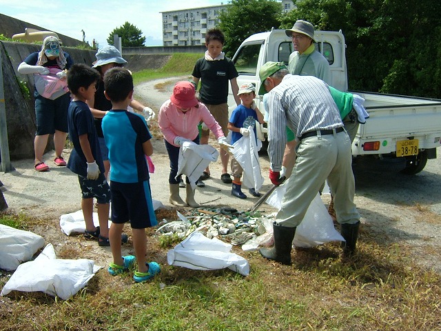 NPOの目的の中に「子どもたちの健全育成」なるものもあり、地元の子どもたちと畑を作ったり山遊びを見守ったりしています。夏休みに入ったこの時期には例年「海の日に川のお掃除」と銘打って、子どもたちと通津川のゴミ拾いをし、その後「そーめん流し」をして楽しみます。今日は川が増水していることでもあり、河口の海岸の掃除をしました。残念ながら子どもと付き添いの親(3年生以下には要付き添い)の参加は10人と少なめでした。