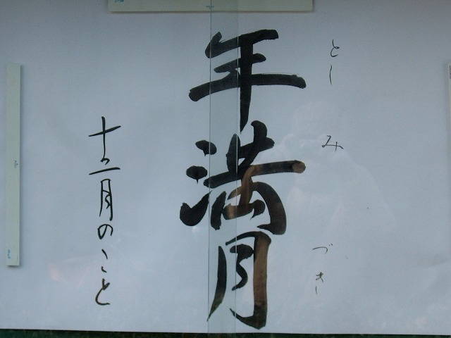 お寺の掲示板です。「年満月」は「としみつき」と読んで12月を指すようです。初めて知りましたが、濁音がないので「きれいな響き」です。
