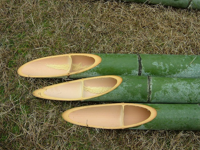 初めに材料を集めるところから始めるのですが、施設の建物は大きいので竹は極太の孟宗竹です。1本でも私にはとても持ち上げられません。