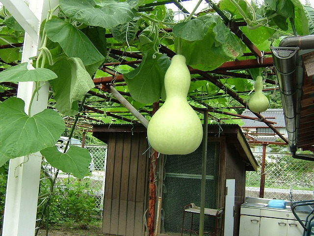 先日大きな葉っぱを見て「何だろう」と思った植物は「(でっかい)瓢箪」でした。いつの間にか50㌢位になってユラユラ揺れていました。もっともっと大きくなるようです。