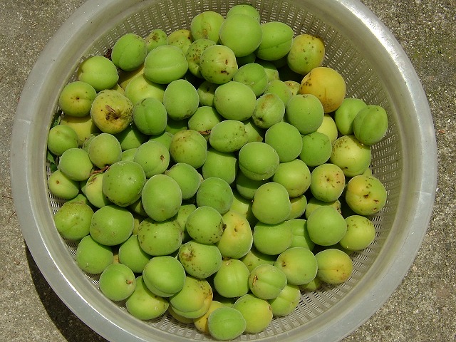 2年余の間留守宅になっているお隣の梅の木に沢山実がつき、雨や風にバラバラ落ちてきます。私は「梅干し」も漬けず(と言うか漬けたことがない)、「梅酒」は何度か作ったけれど飲まず(と言うか飲めない)、従って梅の実に興味が湧いてきません。とは言うものの落ちた実が踏みつけられるのも汚いので(雨を前に)連れ合いが収穫しました。