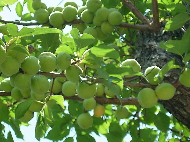 バケツに2杯も収穫したのにまだ木には鈴なりです。こうして見上げるととてもきれいなのですが・・・。この梅の実は「種ばかり大きい」と聞いたことがありますが、明日辺り友人が引き取ってくれるようです。