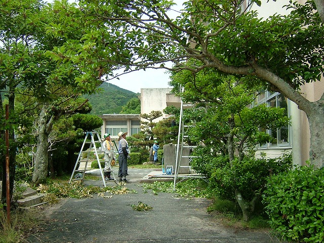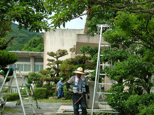 昨日に予定していたNPOの作業(通津中学校庭木剪定)は、昨日の降り具合では「とても無理」と思っていたのですが・・・。湿度が高すぎる難はありましたが良く晴れました。水分をたっぷり含んだ木々の扱いは大変ですが、会員が汗びっしょりになりながらも楽しげに作業する様子を見ると誇らしい気持ちになります。