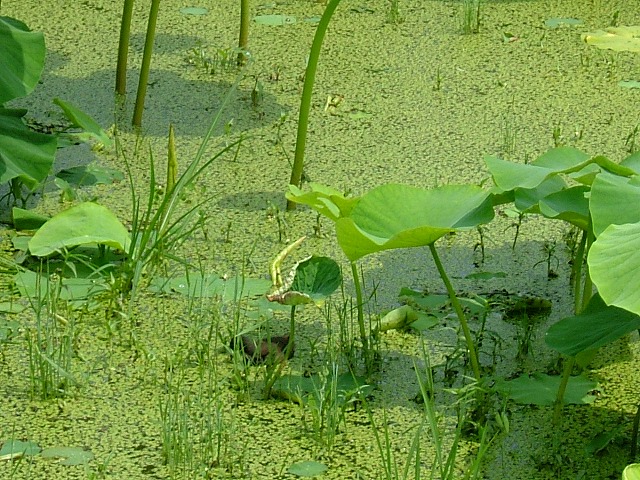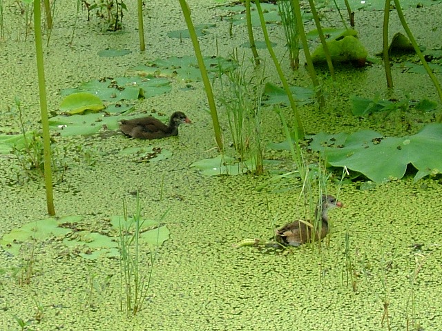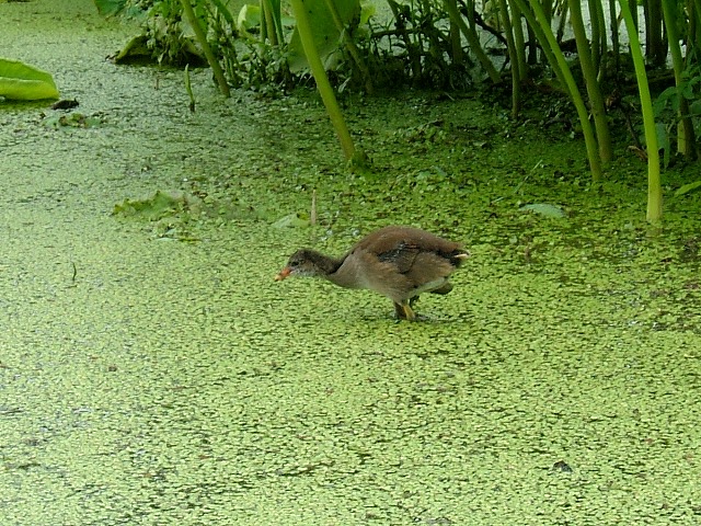 校舎の裏手にハス田があり、そこに動くものを見つけました。幼鳥です。カモかと思いましたが、黒い羽根や赤い嘴で「バンじゃないか」と教えてもらいました。変な名前なので半信半疑でしたが、帰宅して図鑑を見たらありました。「バン」に間違いありません。信じなくてごめんなさい。