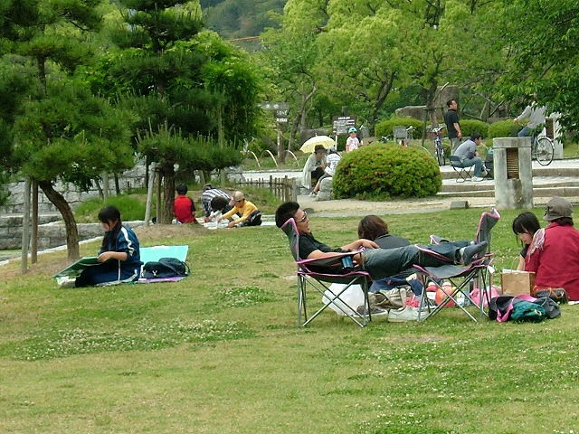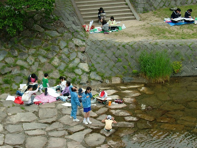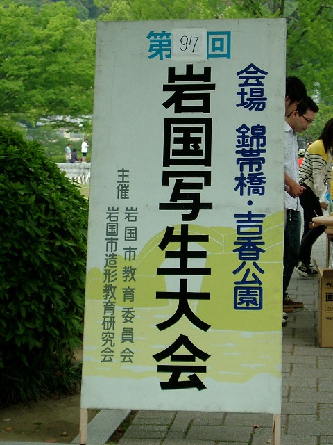 友人が総会に出ている間、(総会は詰まらないから出ない不謹慎な)連れ合いと私は久し振りに錦帯橋付近を歩いてみることに。丁度写生大会の日に当たっていて滅多に見ないくらいの人出でした。