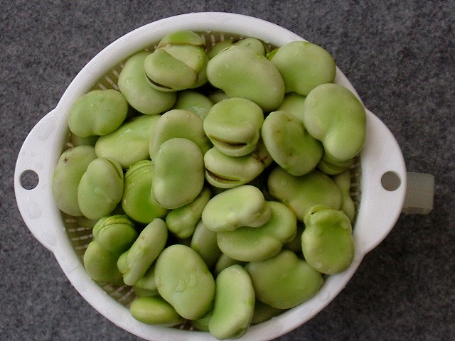 続いてソラマメ。皮をむくと大きな実がゴロゴロ出てきました。ビールのお供に大好物の連れ合いはいません。