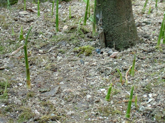 枯れたユズの木の下の雑草に隠れて(例年通り)茗荷の芽が出てきました。暑い陽ざしに背中を照らされながらきれいにしました。これからどんどん茂り、その根元に(薬味の)茗荷ができます。それにしても・・・甘くも辛くもなく、感じようではちょっと変わった香りの茗荷を最初に食べた人は凄いですね。日本人のデリケートな舌ならではの食べ物と言えるでしょう。