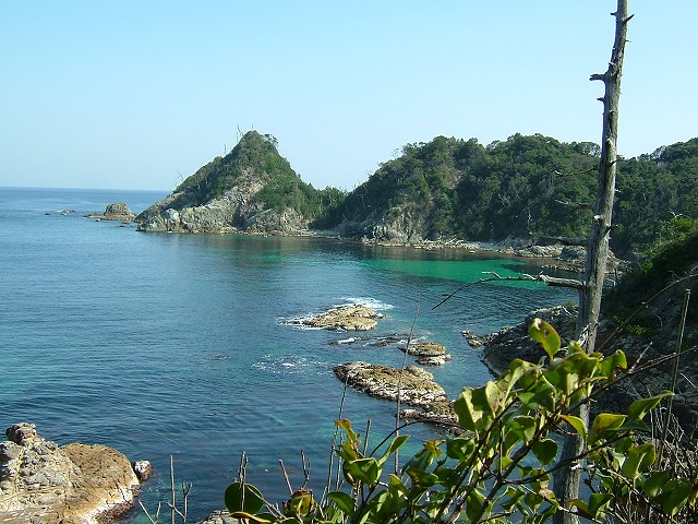 息子がネットで見つけた格安クーポンで宿泊する宿は、萩の市街からは遠く外れた島根県寄りでした。安価すぎて「安かろう・悪かろう」もあり得ると覚悟しましたが、部屋のテラスからの眺めです。瀬戸内海を見慣れた目に日本海の透明度の高さが珍しく、感激しました。