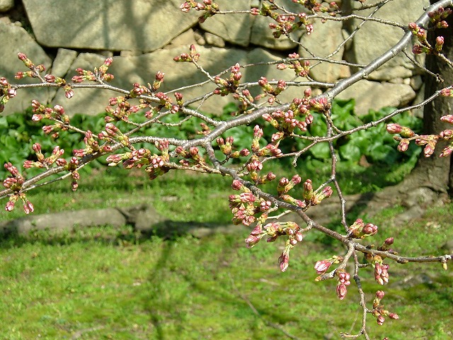 もう数時間太陽が照れば咲きそうな萩城跡の桜。