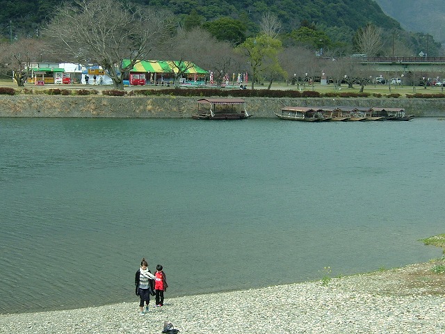 桜を期待して訪れたかも知れない観光客がホドホドで、肝心の桜はまだ一息いや二息三息くらいの時間が必要そうです。対岸の土手には「一儲けしよう」と茶店が立ち並んで準備は万端。鵜飼船は6月の鵜飼開始までお休み中です。桜が咲くと休日には「花見船」が出るはずです。