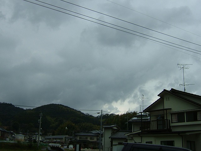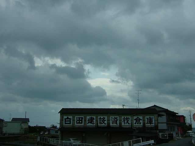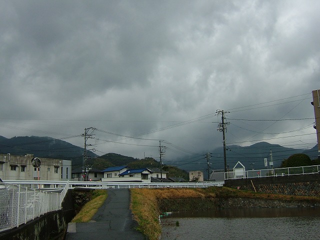 強い雨がやや収まってきた昼前、強風で傘はさせないので帽子にウィンドブレーカーという出で立ちで出てみました。どこかで見たことがある格好だと思ったら、雨の中で交通整理をしている人と同じでした。怪しげな雲行きの写真を撮りながらウロウロしていて知人に見つかり「雨ん中何しよるんかー」とあきれらたりしました。