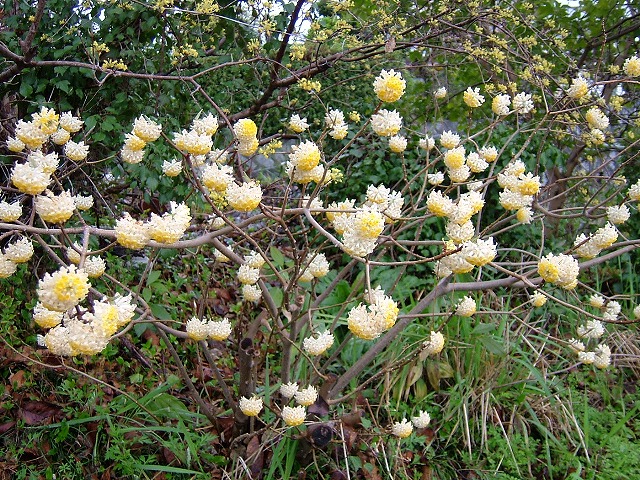 「みつまた(こうぞ)」地味な花ですが、紙の原材料として珍重された木です。