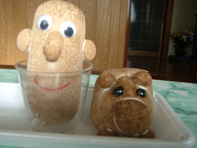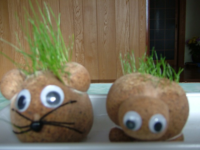何日か前に載せた「怪しい連中」の内二つ目の「カメ(?)」にもポニョポニョと草が生えてきました。オッサンとブタは相変わらず知らん顔です。彼らは(多分)木くずを固めて作られていて頭の部分に「草の種」が仕込んであるようです。時々水をかけます。