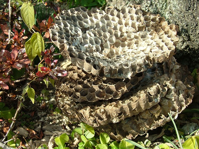 昨夏何度もハチに刺されて病院へ駆け込んだ連れ合いが、この時期ルスになった彼らの棲み家を集めて「かたき討ち」をしています。立派な4階建ての巣と芸術的なスズメバチの巣です。