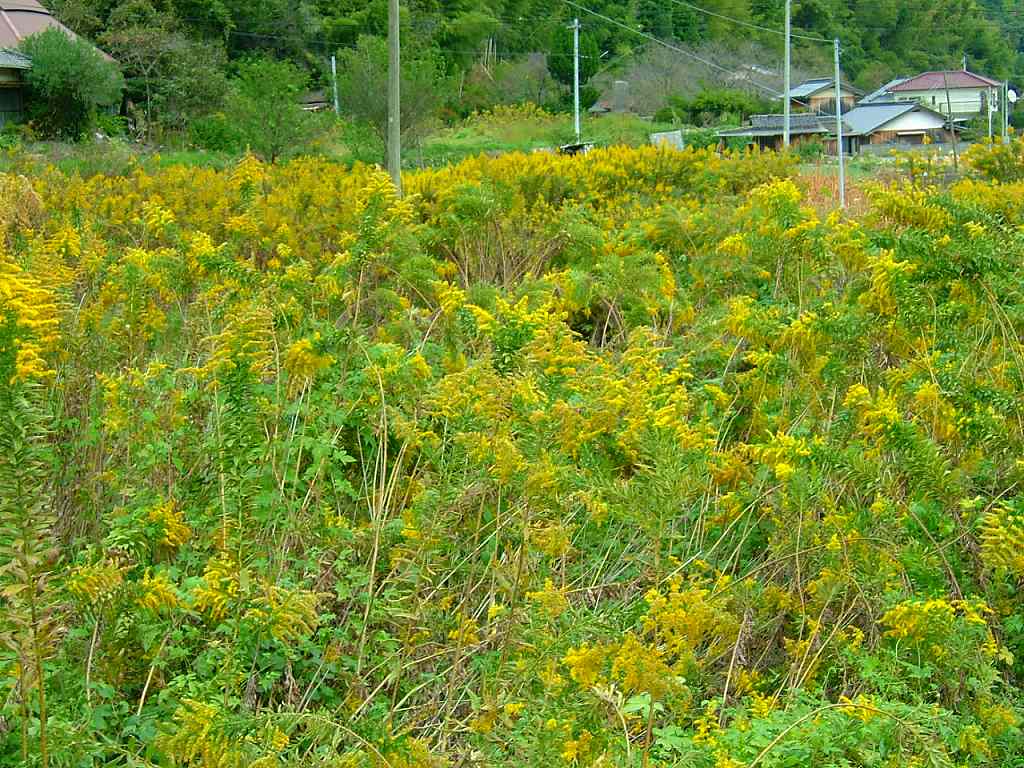 休耕田の荒地いっぱいに咲いた「背高泡立ち草」です。終わりかけで色が褪せていますが、こんな風景はワビシイです。