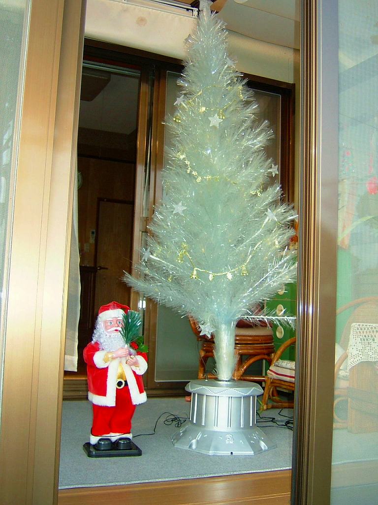 クリスマスツリーは180㌢の長身です。点灯すると優しい色で点滅し、傍に控えるサンタさんは手に持ったもみの木と一緒に上半身を揺らします。