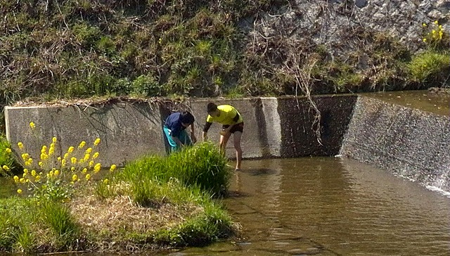 山を下りると春休みになった子どもが川に入って何やら網で漁(?)をしていました。水ぬるむ春を目で確認。