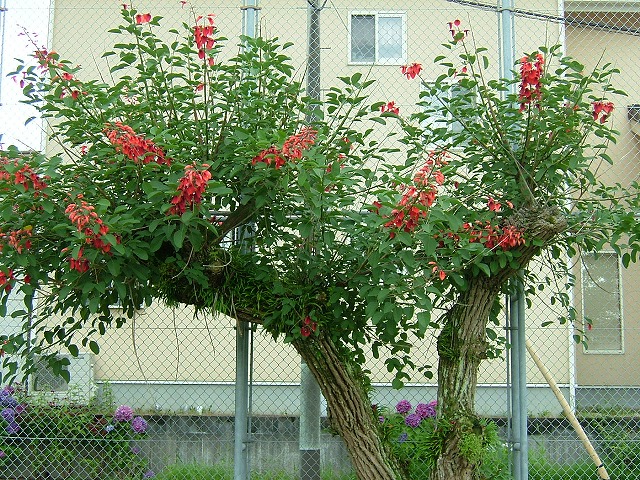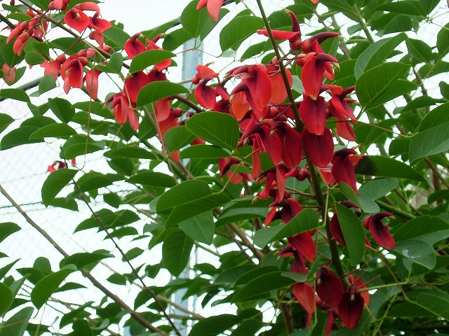 「海紅豆(かいこうず)」または「アメリカデイゴ」と呼ばれる花です。たまにしか見ることがありません。沖縄では街路樹にデイゴが多く植えられていますが同じ仲間です。