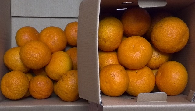 「甘夏」なのか「ただの夏みかん」なのか定かではありませんが、とにかく「夏みかん」です。「花が咲き始めたら実を採るんよ」と教えて貰った(と思い込んでいるだけかも・・)ので、花の甘い香りを待って採りはじめました。今年は数が多く(約150個位かな?)、実がやや小ぶりな感じです。私は味見どころか全く食べないので、好きと聞いている方々に強制的に送りつけています。味は別にして自慢は「完全無農薬」「ノーワックス」で、要するに放っぱらかしですが、律儀に毎年実ります。