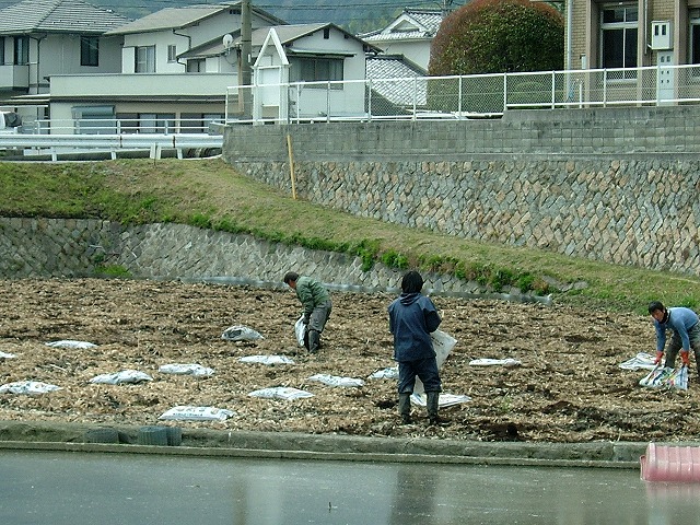 前の田圃に積み上げられていた140袋の肥料か土が次から次へと撒かれています。異臭がしないところをみると、やはり土のようです。