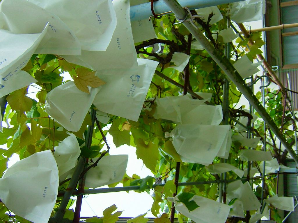 昨日・今日の二日間でブドウの袋かけをしました。越してきた頃は沢山の収穫がありましたが、ほったらかしにしていたら、昨年は葉っぱも繁りませんでした。暑い夏の日には丁度良い日陰を作ってくれるのが有難かったのですが。今年は連れ合いが「ブドウを生らせよう」と剪定をしたら、そこそこに実をつけはじめました。大方の女性は果物と生野菜が好きだと思われているようですが、私は大方ではないようです。胎内に長男を抱えていた時に、その趣向は全て彼に譲ったらしくブドウを含む果物は嫌いじゃないけど好きじゃないのが本音です。袋かけは結構辛抱がいる作業ですが、私が口にする事はないでしょう。頑張って50位かけましたが、中途半端な実はどんどん切り落としました。白い花が咲いたような袋と哀れにも捨てられた実です。