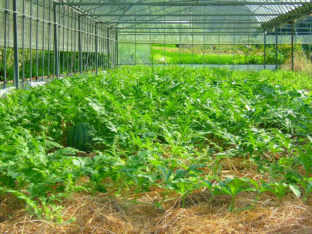 ツルがどんどん伸びてハウス内を自由に這い回っているスイカとマクワウリ。