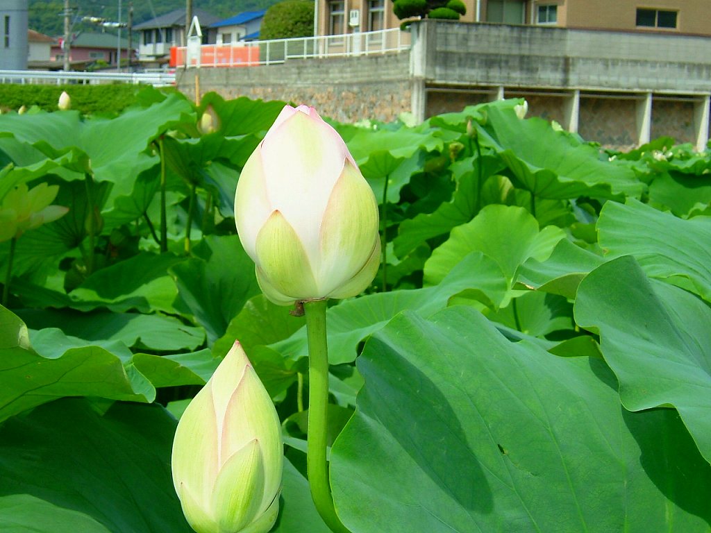 ややピンクの花が咲く事もあります。白の中のピンクはきれいなのですが、その地下のハスは、あまり良くないそうです。