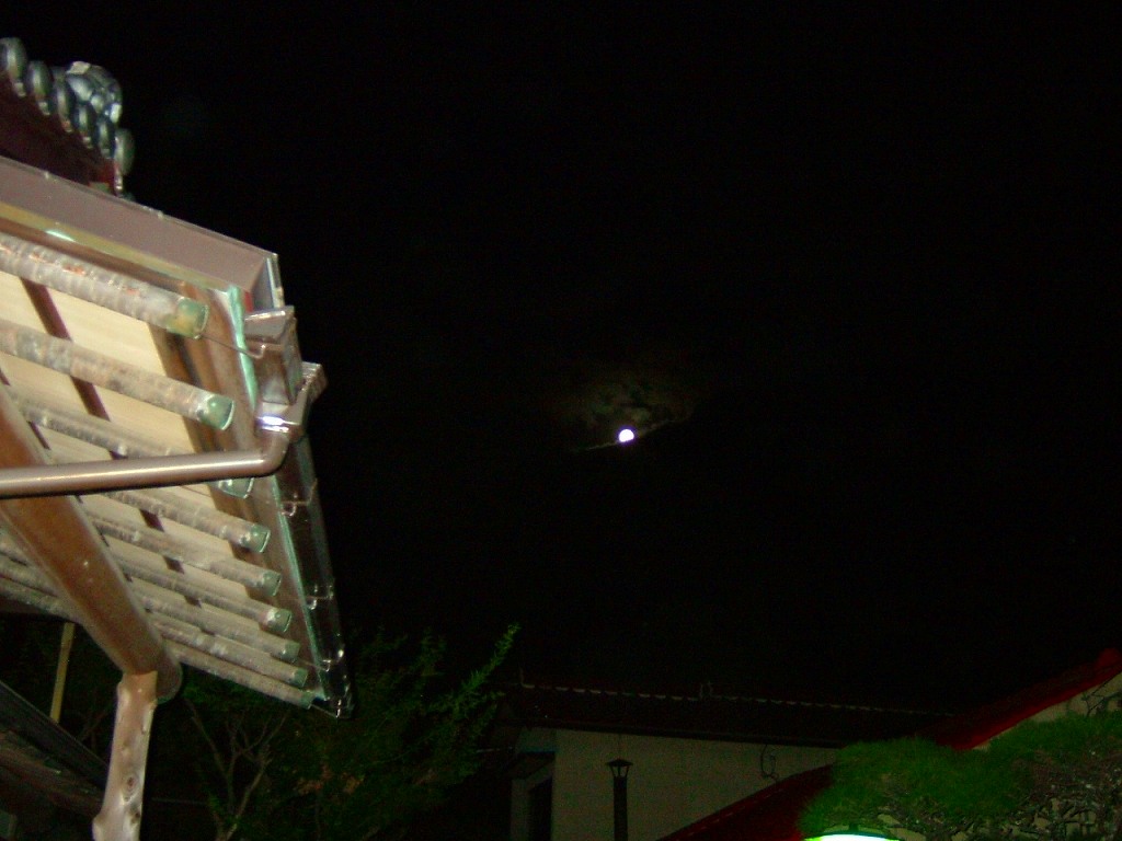 十六夜の月の今夜、徒歩15分の「桜井戸(名水百選)」で「観月会」が行われているのを取材(?)しに行ってみました。毎年行われていますが、8年目にして初めての経験です。桜井戸の公園周囲には提灯が灯り、思ったよりも多勢の人が集まっていました。小さなステージも作られており、白いブラウスの胸に赤い造花・黒のロングスカート姿の数人の女性が詩吟を吟じているかと思えば、テントでは300円でお菓子とお薄が振舞われ、周りを何人かの子ども達が走り回っている・・なんともまとまりに欠ける光景で居心地悪く、さっさと引き上げてきてしまいました。肝心の写真はシャッタースピードを間違えたようで、全て「心霊写真」のように撮れてしまい残念!