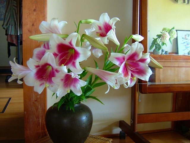 玄関でユリと一緒にお客様を迎える「梅雨の仲間たち」です。拡大して観てください。