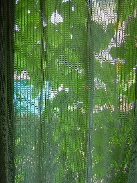 家の中からレースのカーテンごしに見るへちまの「みどりのカーテン」です。実際には室温にどれほどの効果があるのか明確ではありませんが、この景色を見るのが好きです。